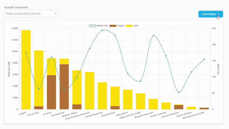 A unique peer comparison tool to find potentially undervalued (or overvalued) companies. The tool uses the development stage of the companies most advanced project and market capitalisation data sorted from lowest to highest to plot peer comparisons based on filters selected by the user like project stage, commodity, market cap limits, cash held etc. and visualising them to understand which companies may be outliers in their peer group.